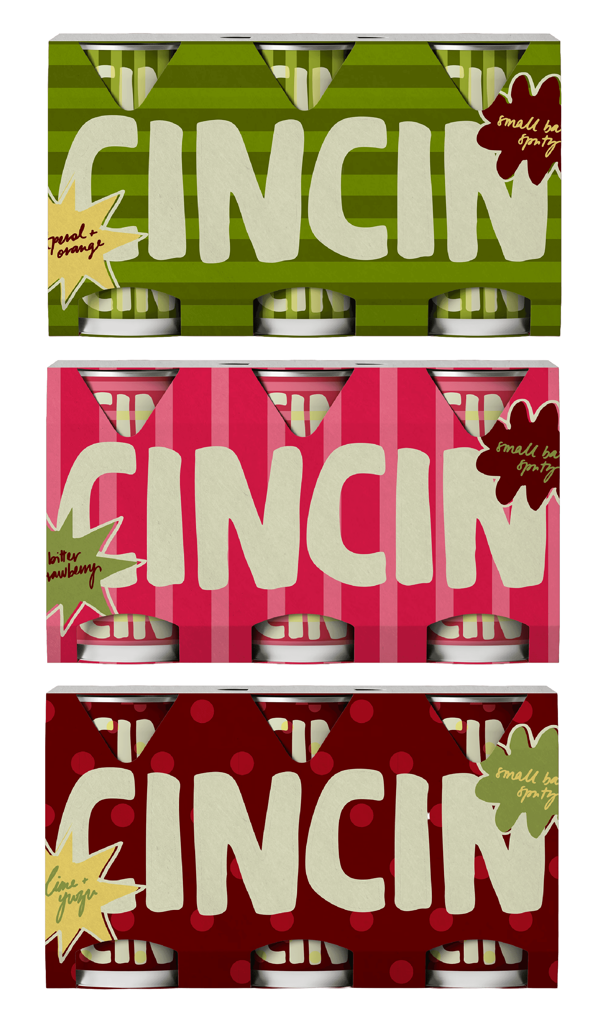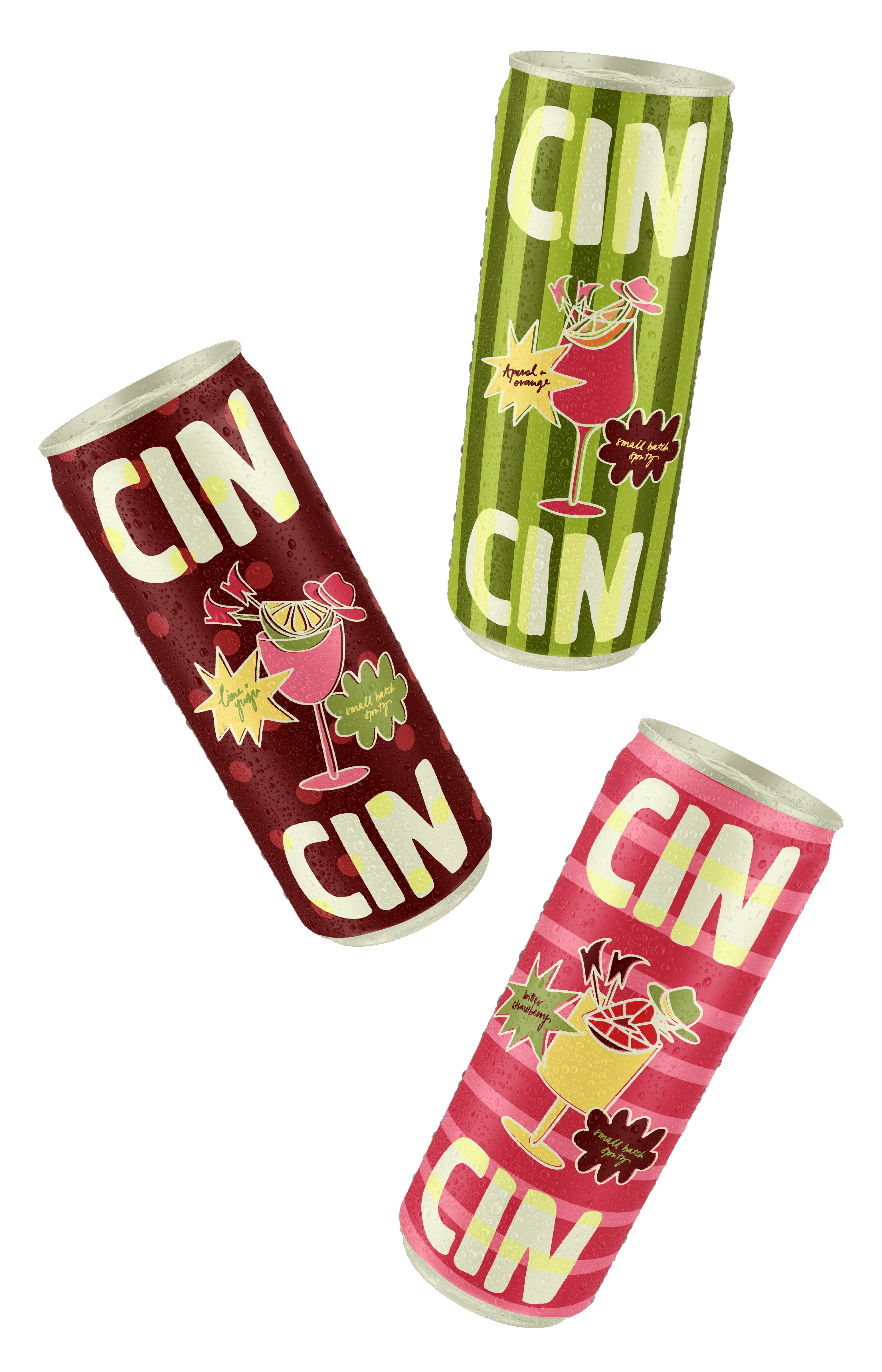 CIN CIN is a brand formed in response to an illustrated alcoholic beverage can design brief. It came from the playful nature of drinking with friends before a night out, and a gap in the market for truly funky branding - think beer can designs, without the beer taste. It is a drink can that you want to show off, a brand with the play of beer but the taste and refinement of a spritz.